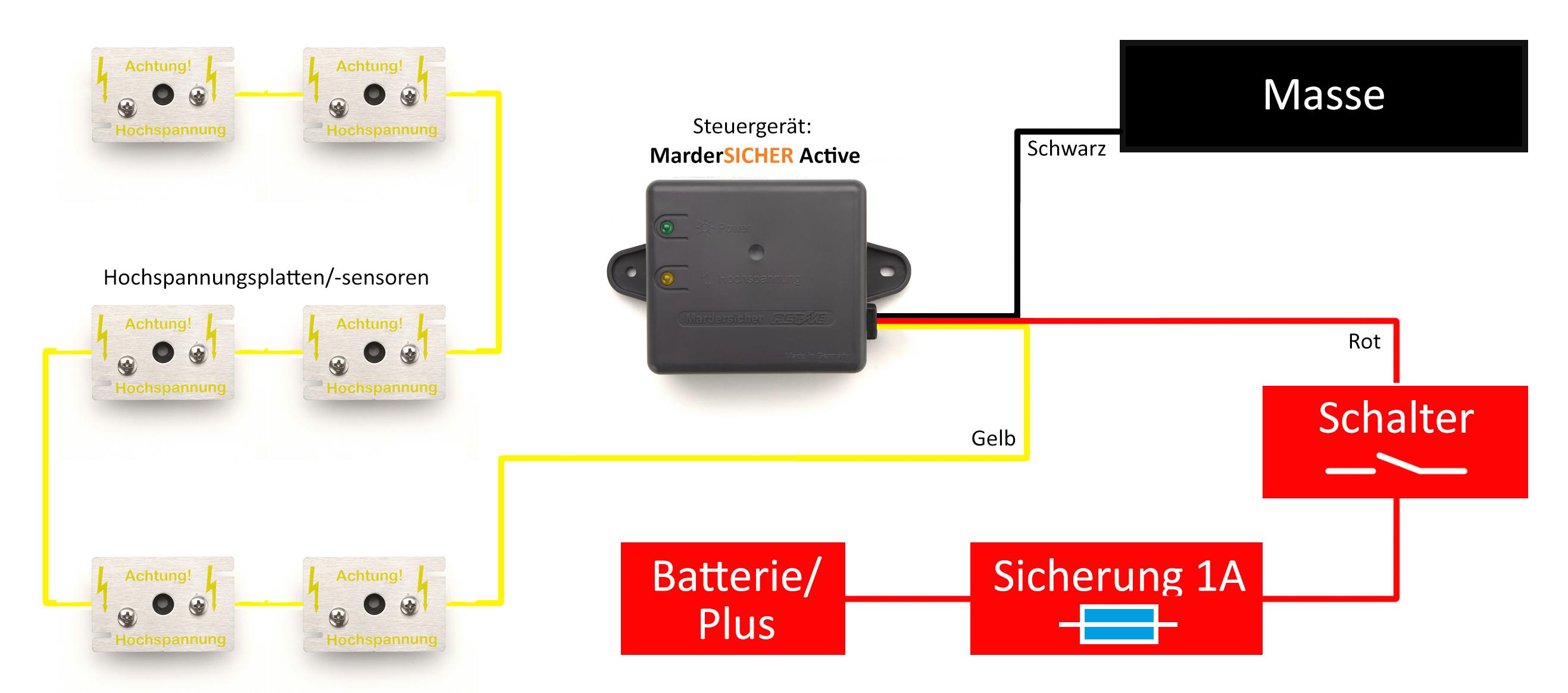 Bei Wartungsarbeiten im Motorraum ist das MarderSICHER-System am Ein/Aus-Schalter auszuschalten. Nach dem Ausschalten wird die Hochspannung in Sekundenbruchteilen abgebaut. Sollten Sie doch einmal mit einem geladenen Hochspannungsplättchen in Berührung kommen, so wäre ein leichter elektrischer Schlag die Folge (wie beim Weidezaun). Menschen mit Herz-, Kreislaufschwäche oder mit Herzschrittmacher sollten diesen Hinweis aus gesundheitlichen Gründen unbedingt befolgen.